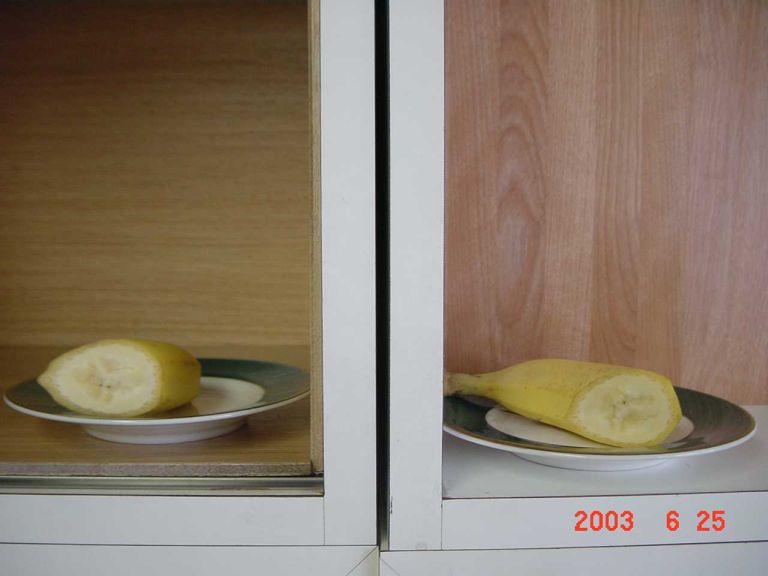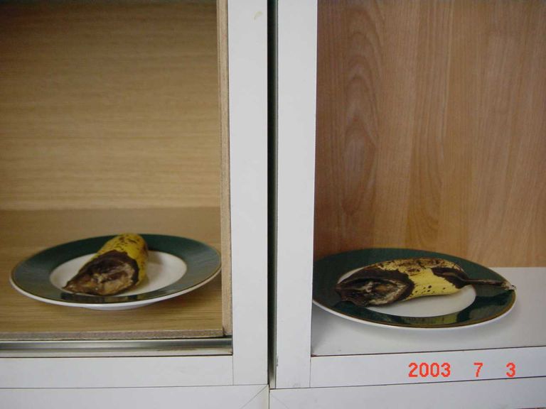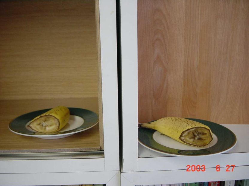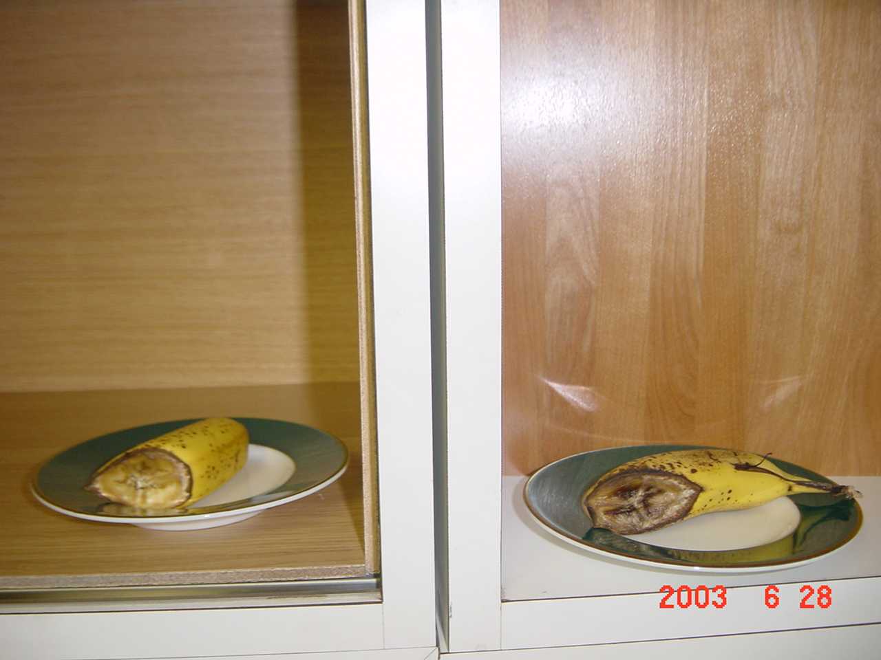 | ■ 実験場所は事務所内のガラス戸付の本箱内で2種類のバナナを置きその効果を比べる。 |