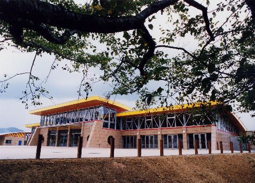 屋根は、牧場丘陵に添った緩やかで大きなカーブの重なりを描きながら、山並みへと調和し、また「静」的でシンメトリーな施設群のなかで唯一「動」を起想させる方向性を持たせている。構造はGL+3.8Mまでが鉄筋コンクリート打放しで、その上に鉄骨短柱を固定することで、木造大断面集成材による曲面フレームを支持している。3種類の異なる材料で構成されたラーメン構造であるが、それぞれの構造体は仕上材としても 視覚的に表現され、構造的合理性に基づいたデザイン展開へと反映させている。放牧地側のファサードのハイサイド部分は透明なガラス面で構成し、放牧地の豊かな緑と光を取り入れ、アルミサッシには木々の梢をイメージしたアルミ斜材を配することで、単調で 平面的になりがちな連窓サッシにリズムを与える実験的手法とした。