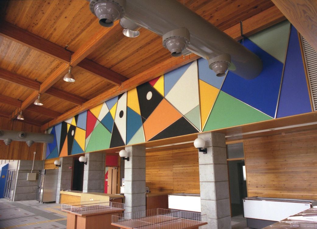 また、ホールは建具を開放することで広場と一体的な 空間としてイベント開催が可能であり、ホール正面の壁面には放牧場をイメージしたアブストラクトアートをデザインし、 空間にふさわしい賑わいと印象性を演出している。