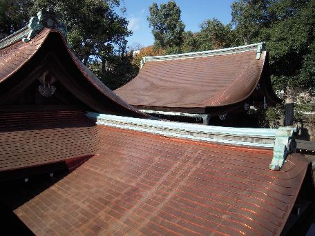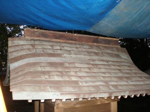 | 小宮屋根の葺替え □本殿の再利用銅板での施工です。 |