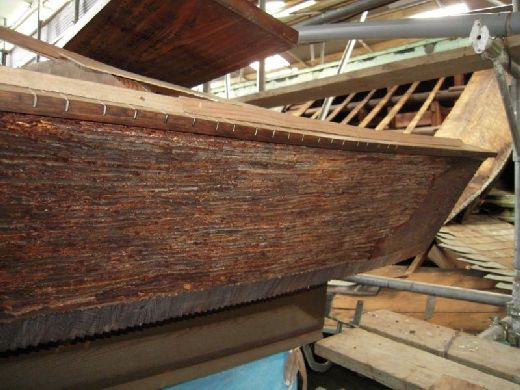 | 桧皮 □傷みヵ所の拡大です。内部から押されて外に飛び出ています。コケが生えています。 □桧皮は今日ではなかなか手には入りにくい材料です。桧皮の固定方法によっては屋根銅板を撤去した際に、桧皮も一緒に外れてしまう危険性があり、補修は相当慎重かつ難しい作業になる事が予測されました。 □当時の桧皮の固定方法としては竹釘が一般的に使われていましたが、水分で腐っている可能性が大であると予測せざるを得ませんでした。 □桧皮補修資料を希望される方はメールでお問い合わせ下さい |