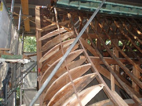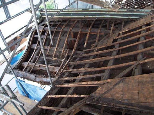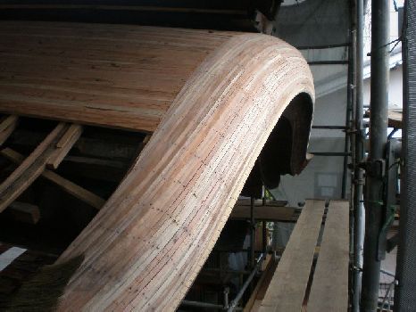 | 本殿の小屋組点検、補強 □本殿の屋根端部で箕甲(ミノコ)といわれる部分の補強状況。屋根の曲線を決定する下地の板が並んでいます。一枚づつ形が違います。 |