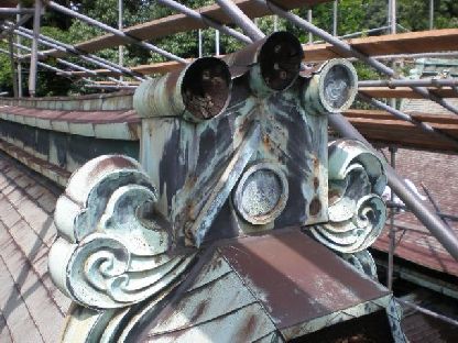 | 銅板葺き替え。鬼の修復 □修繕前の箱鬼 ※撤去したした材は小宮屋根修復に再利用しました。 |