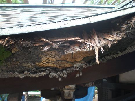 | 屋根 □現在の社殿は昭和初期に建築されました。漏水被害があり、それが原因と思われる、桧皮のずれや腐食が相当すすんでいました。 □屋根下地である野地板、垂木、母屋などの小屋組の傷みも結構すすんでいる事が想定されました。 |
