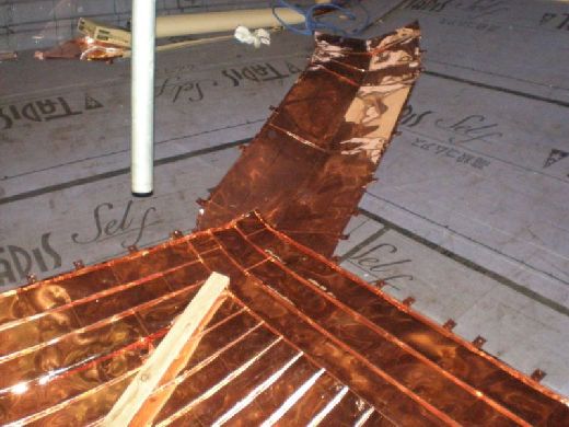 | 銅板葺き施工途中 谷の部分です。 |